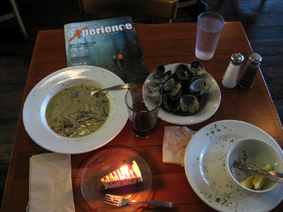 Back in civilization, I followed up on a tip the Goat Hunters had given me. "Be sure to check out the Boundary Bay Brewery in Bellingham !" I did, and it was a treat after eating freeze dried food for a few days. I let slip that my BD had just passed, and the very nice girl serving my table brought out a BD cake with a single candle. A slice of cheesecake, to be precise. What better desert after consuming a bowl of Pacific Steamers (i.e. clams) ?