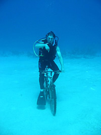 There is a logical explanation. Sort of. It has been a local tradition that when a dive master leaves the island for good because his or her work permit has expired, they ride off into the sunset on the bicycle they used to take to work (the preferred mode of transport above water). More specifically, they ride it off the back of a dive boat and straight down to Davy Jones Locker to join the Wreck of the Oro Verde. Or what still remains of the wreck of the Oro Verde after several recent hurricanes have tossed it around, turning it into "a wreck of a wreck".