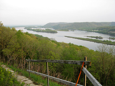 The name "Trempealeau Mountain" is a corruption of the French "La Montagne Qui Trempe a Leau" which means "the mountain whose foot is bathed by water". The water referred to is the Mississippi River, as shown in this view downstream from near the top of Brady's Bluff.