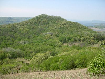 Looking west at Brady's Bluff from Perrot Ridge. Winona, Minnesota is hidden behind this "bluff", as is Trempealeau Mountain.