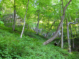 There used to be many miles of trails at several different levels along these deeply wooded bluffs. Most of them have now been abandoned by the Park Department and no longer officially exist. A torrential rainfall several years ago cut big gulleys across the bluff trails and washed out several footbridges. It's too much trouble to restore them now, since the rangers top priority is to collect camping fees from RV campers who require electrical hookups so they won't miss a single episode of Dancing With The Stars !
