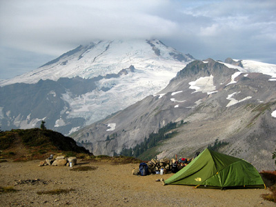The next day, clouds were starting to roll in. The weather forecast had called for rain and possible snow today. Time to break camp and hike back to the parking lot. But the lenicular clouds sitting atop the summits of Mt Baker and Mt Shuksan provided some drama before my departure...