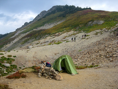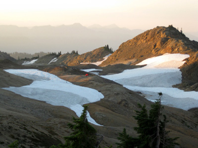 When I finally arrived at the base of the Coleman Pinnacle, I found two other camping parties in the vicinity (red tent below). But that's hardly a crowd up here. There is plenty of room to spread out. The trick is finding a water source nearby. A brook fed by a little snowfield that I have used for this purpose before had completely melted away this year. I had to walk about 10 minutes from my camp to reach a substitute. But at least I arrived in time to take a "bath" (with washcloth) and dry off in the setting sun.