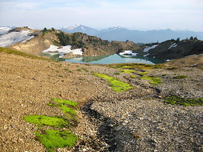 After returning to camp from my daytrip to the Portals of Mt Baker, I wandered down a spur of Ptarmigan Ridge toward Goat Lake. Amazing moss gardens thrive along several snowmelt creeks that flow into the icy lake below...
