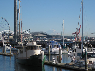 But the forecast predicted rain/snow at higher elevations starting Wednesday, so I knew I had to hustle to get up into the mountains in time to enjoy some good weather. Still, that left a full day to explore Seattle. I walked by the Space Needle, watched a short IMAX 3D documentary about the Lemurs of Madagascar (who has more fun than monkeys? lemurs, maybe!) and wandered along the waterfront toward the Pike Place Fish Market. Clam chowder and a beer at Pier 66 afforded a nice view of Mt Rainier in the distance, behind the marina and the King Dome (or whatever it's called now, after selling the naming rights).