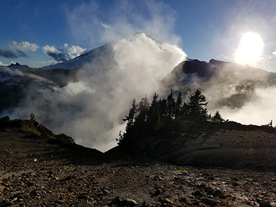 This is better. What a difference a day makes! I'm already close to where I'm going to camp. Mt Baker is dressed in drifting clouds, but the late afternoon sun sure feels good.