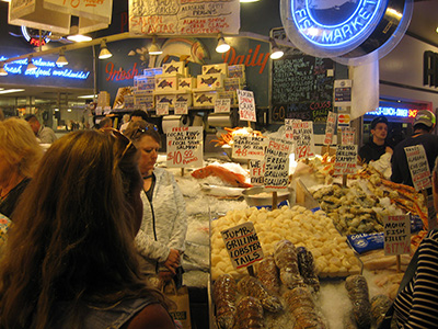 The market sells fruits and flowers and lots of fresh seafood. Also T-shirts of course. And it's great for people watching, too.