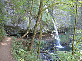 One particular episode stands out in my memory. I had taken my last photo. My camera battery was dead. I hadn't bothered to recharge the night before, since I knew I had to drive back to Seattle and was flying out early the next morning. But what the heck, I still had a half day to do something, and there were plenty of waterfalls left to see ! So after viewing Horsetail and Oneonta Falls (above), I followed the winding trail onward and upward. I found myself looking down upon a narrow footbridge that crossed over rushing water, miles from the road. As I navigated the bridge, I noticed I was not alone.