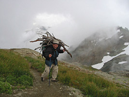 Along the way, I met a couple of fellow mountain travelers, Tim and Daniel. Tim was particularly self-sufficient. He even carried his own wood supply !