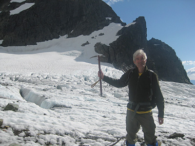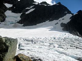 It turned out to be a dog (above, lower right). Finally, the owner showed up. A man of few words, wearing bermuda shorts, and not carrying an ice axe or ski poles or any of the usual glacier travel implements. But obviously, completely at home. So was the dog. They wandered out over the glacier, lightly stepping around the many crevasses. I could tell that this guy, and his dog, were both seasoned mountaineers ! And they helpfully provided a sense of scale to a series of photos I took as they explored the glacier (look close, they're in there). Thanks, dudes, whoever you are !