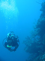 swim out from shore aways. And if you dive to that depth you can hover along the Wall and see lots
