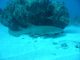 This particular nurse shark was peacefully sleeping under a coral ledge until we rudely interrupted its snooze.