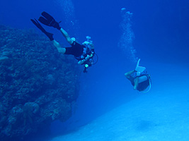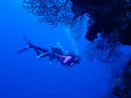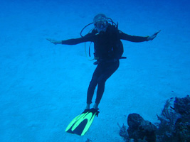 But after one full day on the beach to acclimate and a few phone calls to local dive operators, I was ready to pay another visit to the "World Without Sun" again. First stop would be the Cayman Wall on the West End, just offshore from Seven Mile Beach. This is the famous dropoff that surrounds the whole island, starting at about 50' below the surface and leveling off around 6000' or so... until you hit the Cayman Trench and drop even deeper into the Abyss. But most divers limit themselves to the first 100', unless they have really bad buoyancy control. See ya !