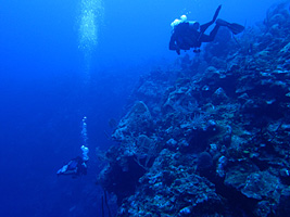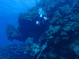The Wall is covered with exotic coral formations, barrel and tube sponges, fan-like gorgonias and other fantastical fauna. And yes, almost all of these are really animals, not plants. They feed on the mostly invisible plankton drifting through the water, just like Great Blue Whales. The bigger they get, it seems, the more they depend on all those little guys. Hmmm...