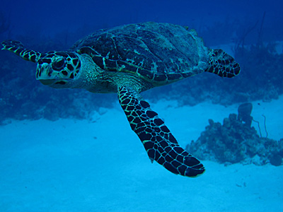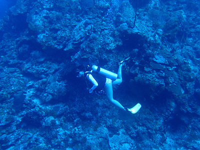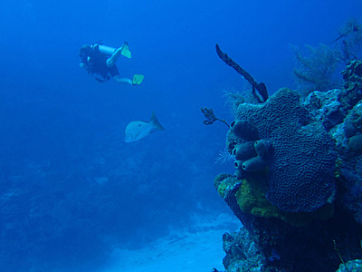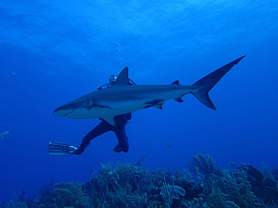 Of all the occasions I've been diving here, this was the first time I've gotten to "swim with the sharks". You're very lucky to catch a glimpse of a hammerhead lurking in the depths along the Wall. Once I got close enough to a nurse shark sleeping under a coral ledge to touch it's tail. But that was after a girl did it first!
