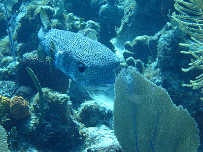 Above, a porcupine fish, a kind of inflatible pufferfish with extendible spines. Below, a hawksbill seaturtle.