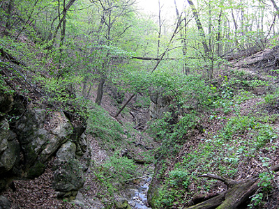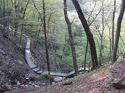 This is where the official "trail" ends. I remember when an ancient foot trail, sans boardwalk, continued down the gorge along the watercourse, all the way down to the Mississippi below. But I wouldn't go there, if I were you. The are few electrical outlets and the cellphone reception is so-so...