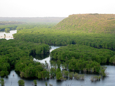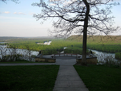 The viewpoint above looks up the Wisconsin River, right where it meets the Mississippi. This is where the French explorers Marquette and Joliett arrived at the Mississippi after portaging from the Fox River to the "Oisconsin" near the town of "Portage", then following it downstream.